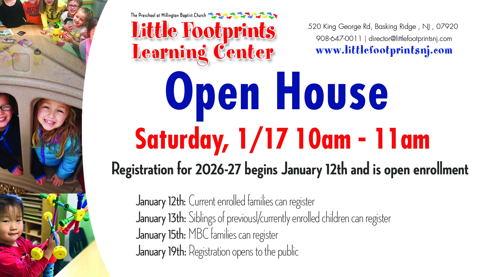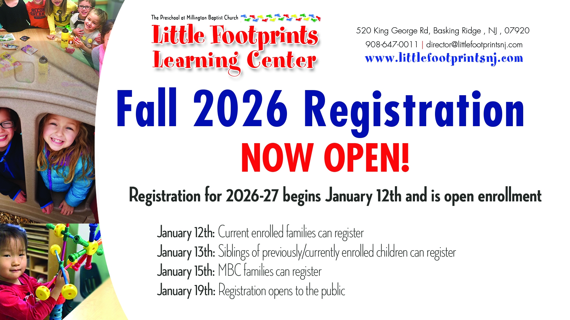 Little Footprints Learning Center is a ministry of Millington Baptist Church in Basking Ridge, New Jersey. We offer a safe, nurturing preschool for 2 ½ to 5 year old children. We strive to provide a quality education in a loving Christian environment and invite you to browse our website to learn more about our program. If you have any questions or wish to have a tour of our facility, feel free to contact us.