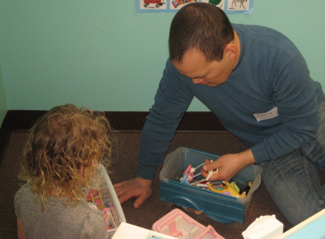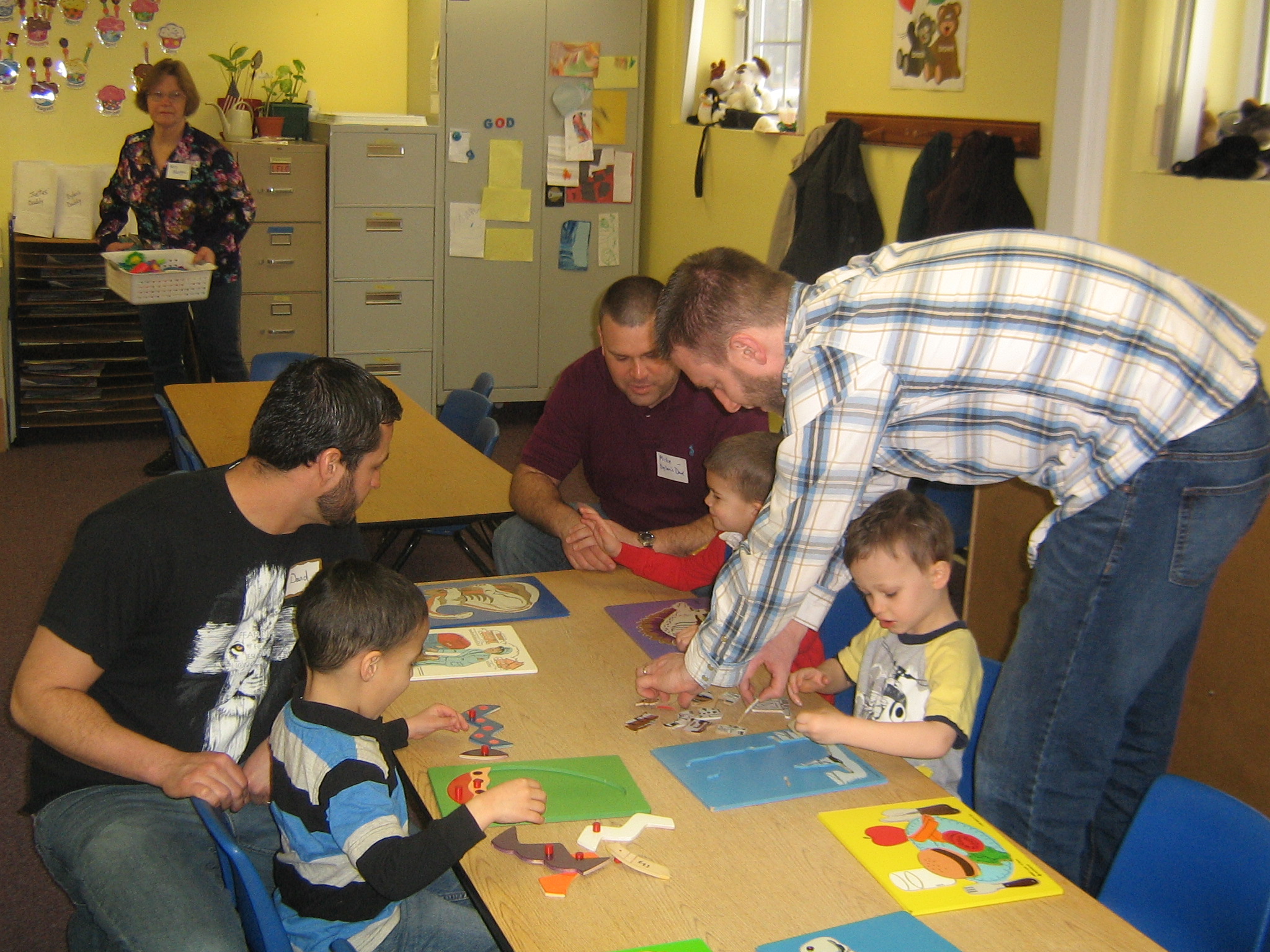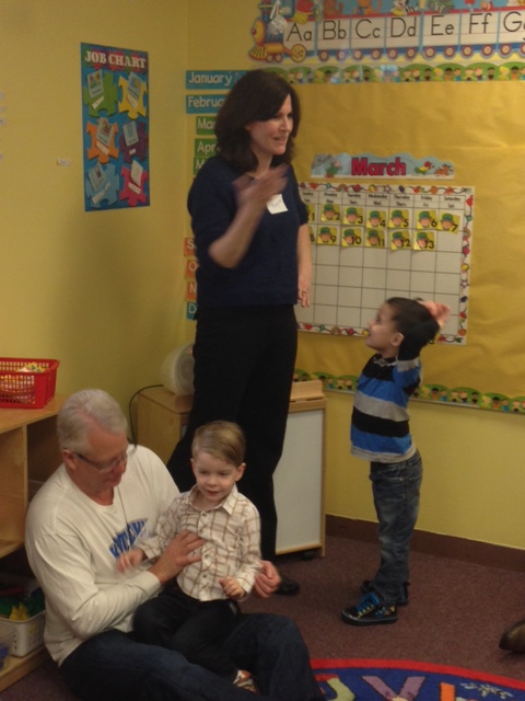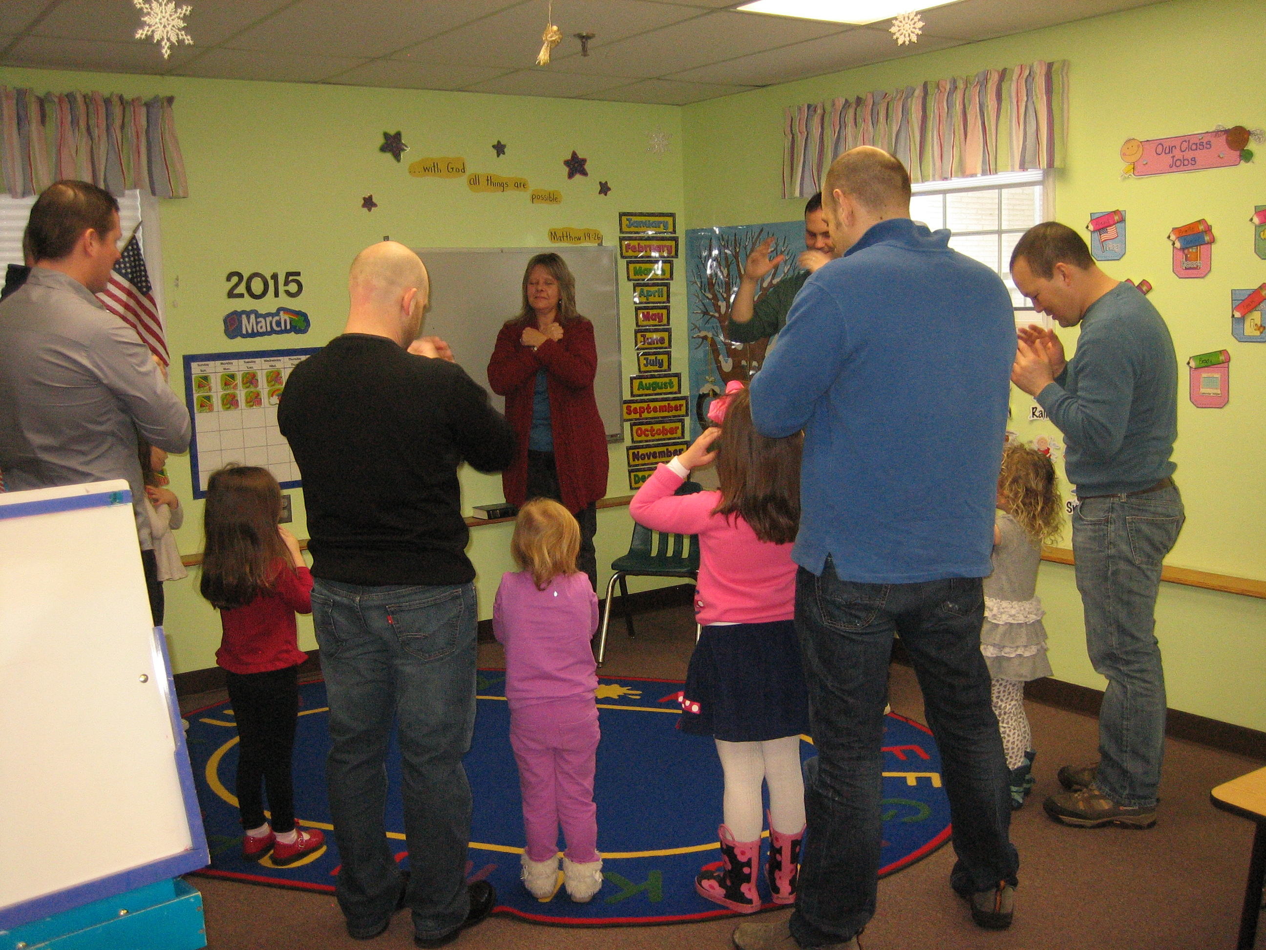 After play time, the children show their dads how well they clean up. Then together all participate in a short circle time. Circle time includes a few songs, the calendar and weather for the twos and threes. The fours also do a table paper with their dads as part of their circle time activity. I love watching the pride on the faces of the children as they are so proud to show Dad what they have learned. Of course, the dads couldn’t be prouder of their children.