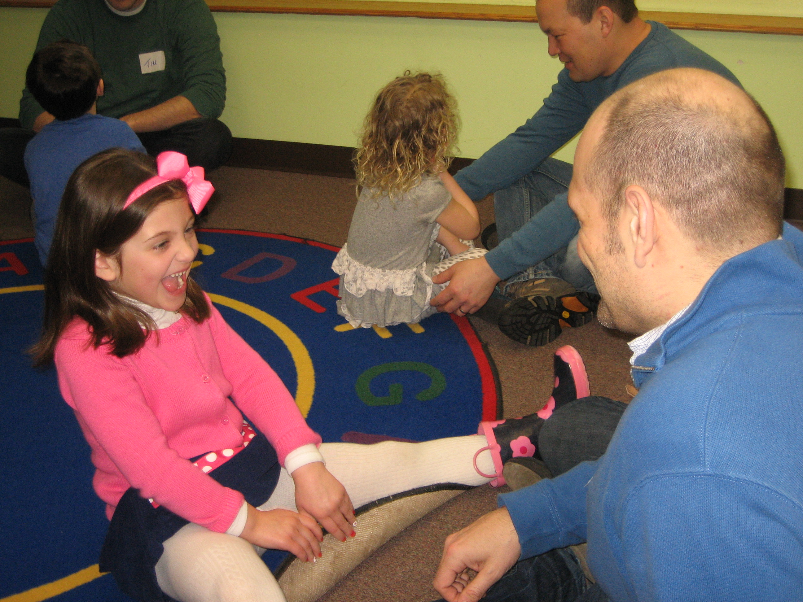 After circle time, everyone lines up to go to the gym for an organized game. Yes, dads play too! Then we are off for a potty break and snack. The morning concludes after snack with a special song and gift for Dad.